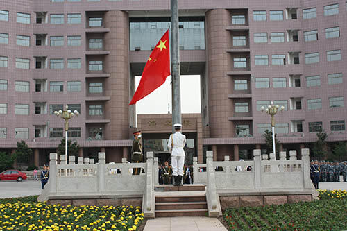 仪式伊始,王翔宇安排到场人员就位,仪式主持人宣布升国旗仪式开始。旗手出旗,伴随着乐曲声,国防生三军仪仗队迈着铿锵有力的步伐穿过鸿远楼前广场走向升旗台。在慷慨雄壮的义勇军进行曲中,鲜艳的五星红旗冉冉升起,国歌响毕,五星红旗在旗杆顶部迎风飘扬。