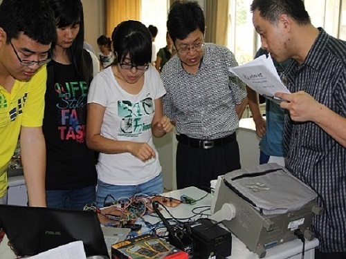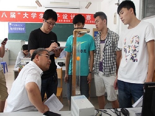 评优答辩按题分为5处同时进行,参赛选手3人一组,分工明确,运用数字、模电技术知识,以单片机、可编程器件为依托,制作参赛作品。由于经过长期准备,参赛选手充满信心,面对评委老师的提问从容不迫,在进行功能展示的同时,运用专业知识对评委老师提出的问题做出解答。作品以高精度,低功耗为标准,在达到基本指标的同时,追求简易便捷,自由发挥,赢得必威西汉姆联经理张存山的连声称赞。他指出,此次竞赛参赛选手表现亮眼,富有创意,真正将理论和实践相结合。