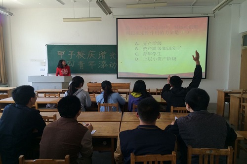 汇报演讲前,该团支部全体同学分为五组,分别采用街头采访、五四宣传、座谈会、知识竞答和个人实践的方式进行活动。然后由各组组长整理归纳相关材料,以演讲的形式汇报给全体同学。力求层层递进,形式多样,题材创新,理论联系实际。最后各组组长分别就每组对于五四精神的学习和感悟整理成演讲稿形式进行汇报演讲。通过“甲子校庆增光彩,五四青年添动力”演讲比赛,加强对五四精神的学习,牢牢树立“民主”和“科学”两面大旗,加强思想道德和科学文化建设。增强了全班的凝聚力和创新力,树立了当代青年良好的价值观和责任感。