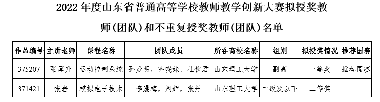 根据《山东省教育厅关于举办2022年度山东省普通高等公司教师教学创新大赛的通知》(鲁教高函〔2022〕39号),必威西汉姆联自2021年11月份开始,积极组织教师报名参赛。在校赛过程中张厚升老师的《运动控制系统》教学团队、张岩老师的《模拟电子技术》教学团队均获得校赛一等奖,并入围省赛。在历时四个月的网络评审、现场评审、组委会审核后,两支团队分别获得省赛的一等奖和二等奖。