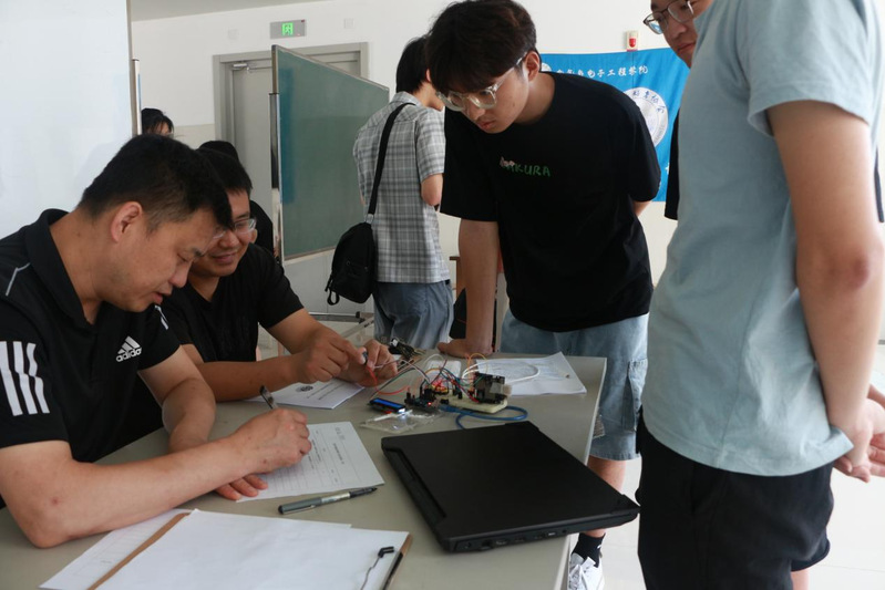 比赛测试期间,评委老师除了对每支队伍的结项论文进行审核外,还针对各组实物展示进行点评,有针对性地给出修改和完善的意见,并根据实际完成度进行打分。参赛选手们充分发挥自身的专业知识技能和团队合作精神,秉持着“实践出真知”的精神,丝毫不敢懈怠。
