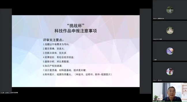 马立修老师结合多年赛事经验,介绍了附件材料的整理、专利要求、PPT的制作、答辩要求、展板制作等科技类作品申报的注意事项,并对此次公司所申报的项目提出了针对性的建议,马立修老师还以国奖获利项目为案例,对科技类项目申报书做了全面分析,系统地介绍了填写申报书的重点和注意事项。对于部分同学的疑问点,马立修老师做了逐步分析和专项解答。