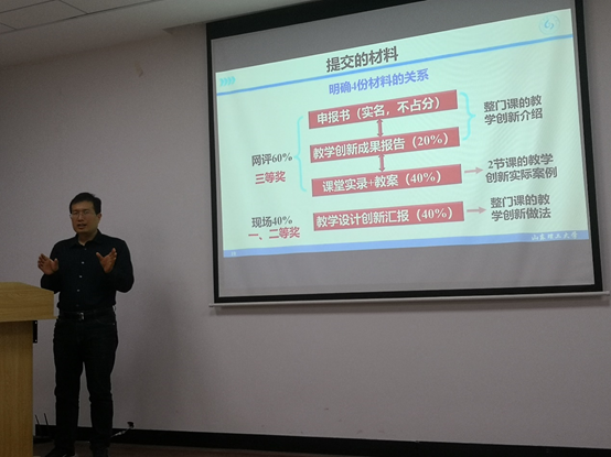 张厚升教授就提交的四份材料(申报书、课堂教学实录视频和相关材料、课程教学创新成果报告、教学创新设计汇报)从要求、材料的关系及评分标准进行了详细的讲解。