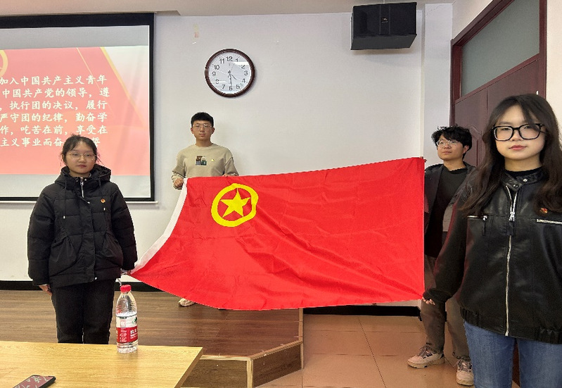 团员代表毛星凯带领新团员宣誓。庄严的宣誓展示了新团员为共产主义事业奋斗的信心和决心,激发了共青团员的荣誉感和责任感。入团介绍人代表闫福宇宣读《团章》中有关团员的义务和权利的条款。