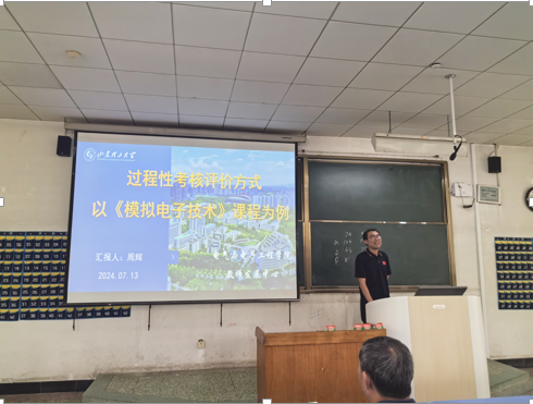 周辉老师就过程性考核评价方式以《模拟电子技术》课程为例从评价维度与标准,评价实施方案及策略、评价方式的新探索等方面做了详细的汇报。