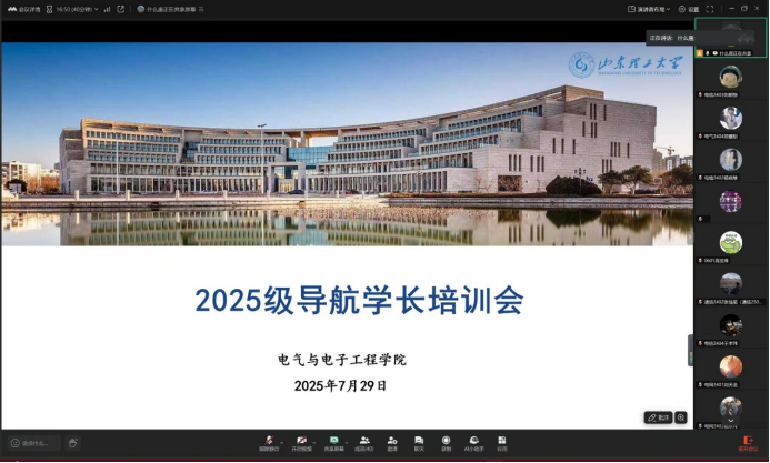 为帮助2025级新生导航学长明确工作职责、提升工作水平,确保迎新工作高效有序开展,7月30日上午,公司举行2025级新生导航学长线上培训会。新生辅导员、2024级部分优秀导航学长代表及2025级全体新生导航学长参加。会议由辅导员唐磊主持。