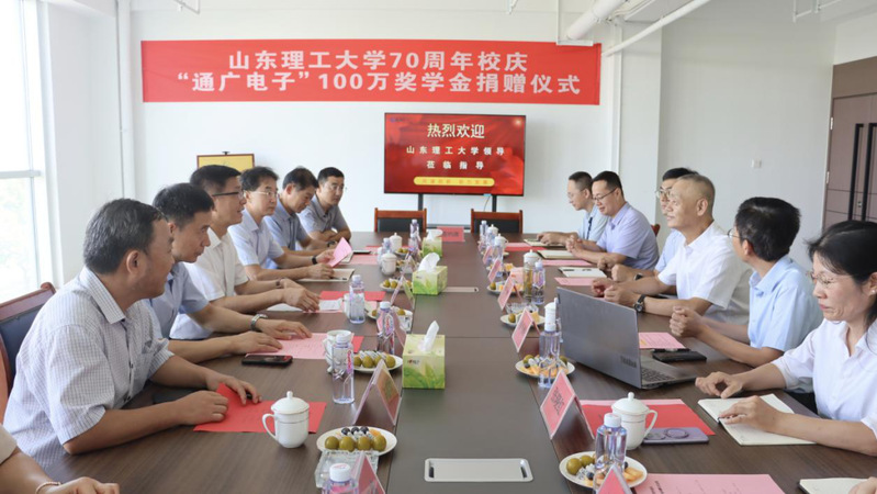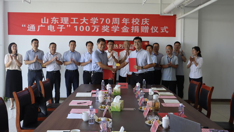 在公司70周年校庆即将来临之际,由山东通广电子股份有限公司捐资100万为必威西汉姆联设立“通广电子奖学金”的捐赠仪式于9月9日上午在通广电子公司会议室举行。公司党委书记于红波、副书记苏守波,山东通广电子股份有限公司董事长王林、总经理王维良出席,党委(董事长)办公室主任魏法汇、合作发展处处长李涛、公司党委书记卢彦峰、副经理(主持工作)彭克、党委副书记王潇伟及企业代表参加仪式。仪式由公司常务副总经理邹海涛主持。
