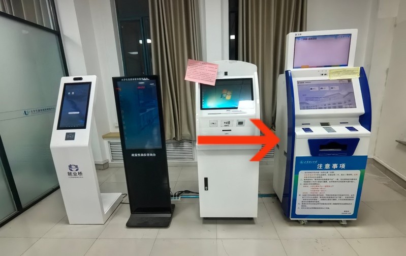 注:四台设备最右边的设备可以打印,使用学号登录或者刷校园卡、二代身份证按照提示要求步骤即可操作!