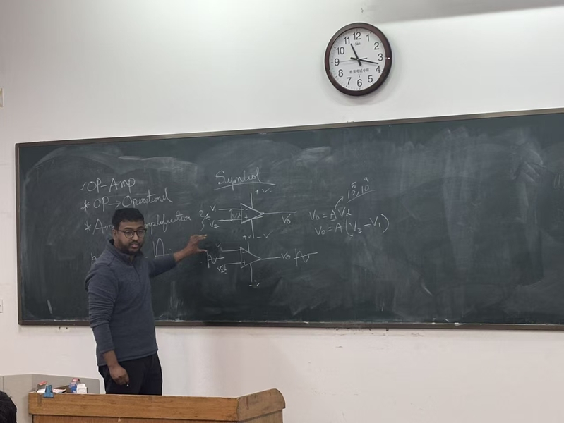 为切实提升教师教学水平,落实教务处《关于组织 2025 年度新入职专任教师 “三段一线” 第二阶段培训的通知》要求,公司于 2025 年 12 月 25 日,在 13305 教室举行了新入职教师脱稿板书考核活动,由公司副经理、教授委员会成员、省教学名师以及青年教师指导教师组成的考核小组全程参与。Tausif Ali、王雪飞、刘越、单越、彭艳如等五位教师依次走上讲台,进行10分钟的板书展示。